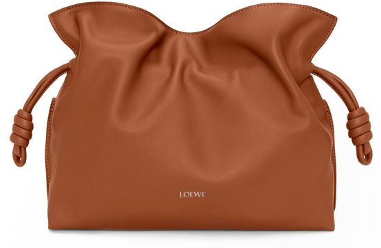 Reveal Loewe's Flamenco clutch, a soft and slouchy bag with a cinched closure and historical knot drawstrings. This medium version is crafted in nappa calfskin. The large interior compartment offers both style and practicality, while the front logo in gold letters adds a distinctive, modern accent to this statement piece.