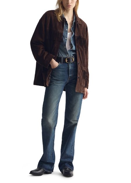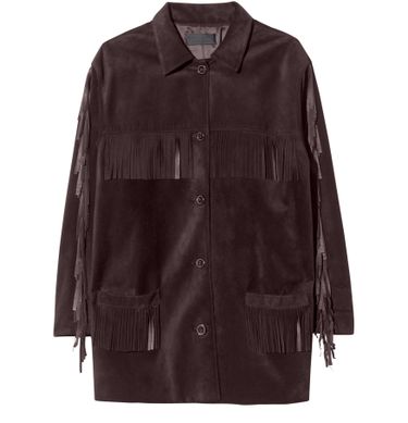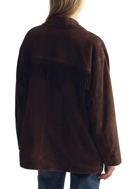 • Description : Lightweight suede jacket with a soft hand feel, oversized silhouette, long-sleeved, fringe details, front patch pockets, front button closure, fully lined.