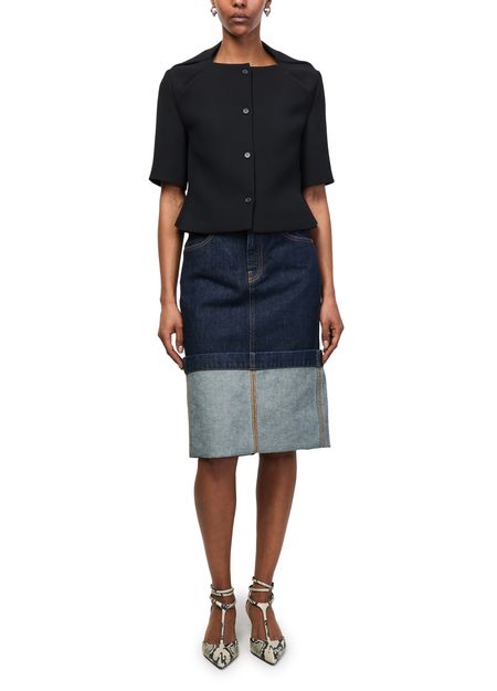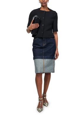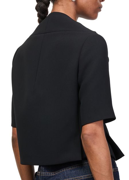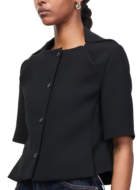 Reveal Khaite's franc jacket, a collarless, short-sleeved piece with a cropped silhouette and front buttoned closure. The minimalist design and short length offer a modern edge, while its versatile style transitions seamlessly from day to night. Perfect for elevating any casual look.