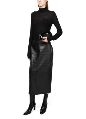 Unveil Toteme's glossy leather boots, featuring a sophisticated closed square toe and a convenient back zipper. These high block heel boots are crafted from glossed leather, offering a sleek silhouette. The logo-printed insole and visible stitching add a touch of elegance, while the leather outer sole ensures durability.