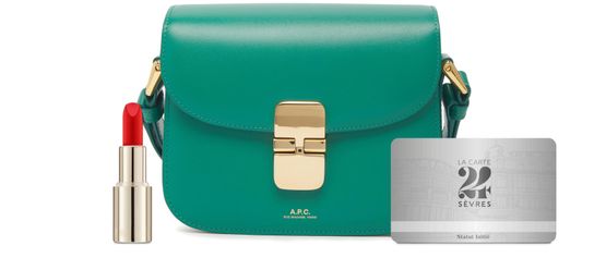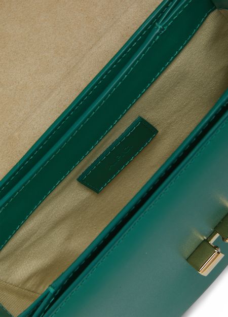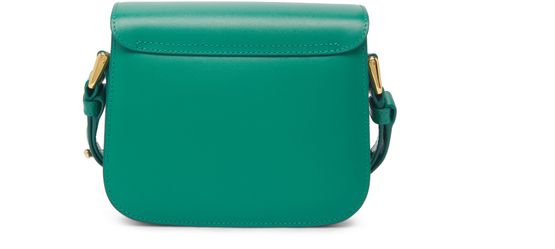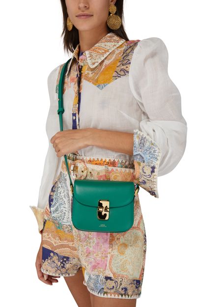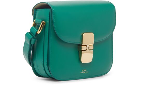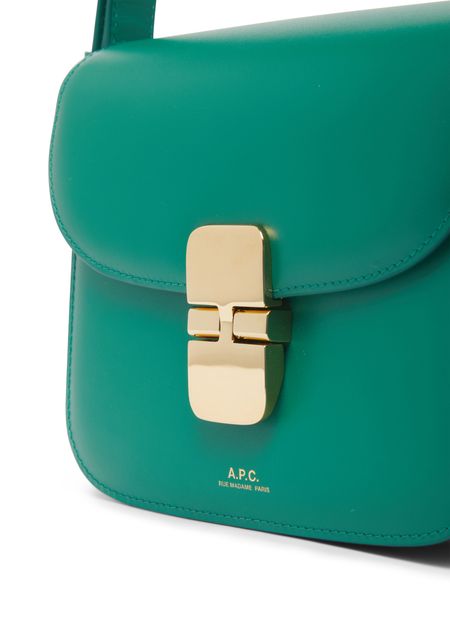 APC's Grace mini bag features a narrow adjustable strap for versatile wear. The iconic logo on the front adds a touch of sophistication to the smooth leather design. The flap closure is secured with a gold closure, making it both stylish and practical for everyday use.
