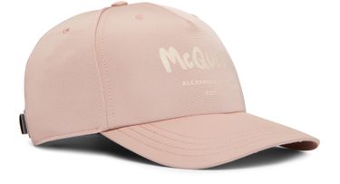 Alexander McQueen's Graffiti Cap features a six-panel design with visible stitching and a curved visor for a classic look. The circumference can be adjusted with the adjustable tab for a customized fit. It is adorned with a printed logo and has a metallic finish for a modern touch.
