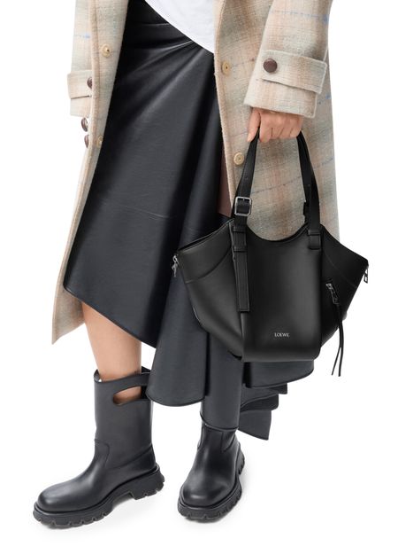 Reveal Loewe's Hammock Flip bag, crafted from smooth leather with double handles for versatile carrying. The front logo in silver letters and visible stitching highlight refined craftsmanship, while the silver finish adds a modern touch. This shoulder bag seamlessly blends iconic design with everyday sophistication.