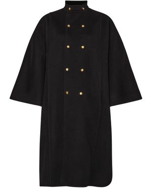 Celine's High-collar cape in double face cashmere is an exquisite piece that elevates any ensemble. With a front buttoned closure and button fastening, it drapes elegantly to knee length. Long-sleeved for added warmth, the cape features a logo at the back label, complemented by a luxurious gold finish for a sophisticated touch.