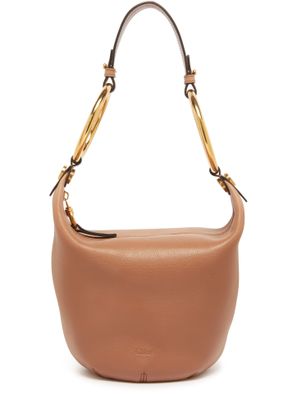 Chloé's Bracelet small shoulder bag showcases a stylish silhouette with a single compartment and a secure zipper closure. Its wide strap allows for comfortable shoulder wear, while the front logo and engraved details add a touch of elegance. The gold finish and visible topstitching enhance its luxurious appeal, making it a must-have accessory.