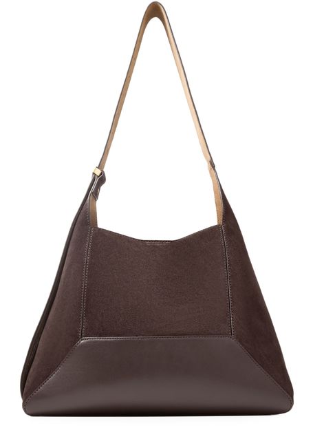 • Description : Shoulder bag, single handle, leather handle, front logo, logo in gold letters, suede, smooth leather, visible topstitching, padded texture.