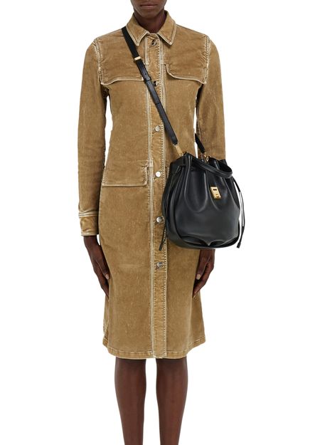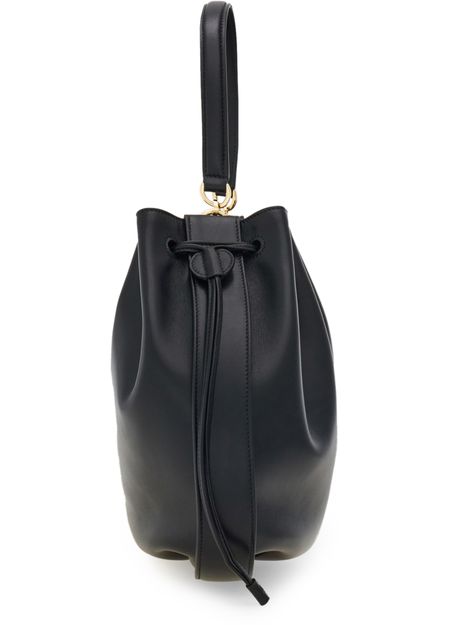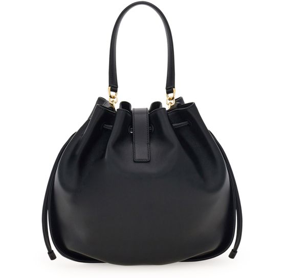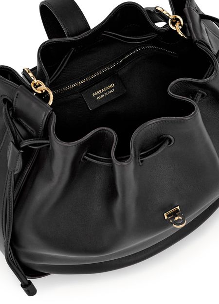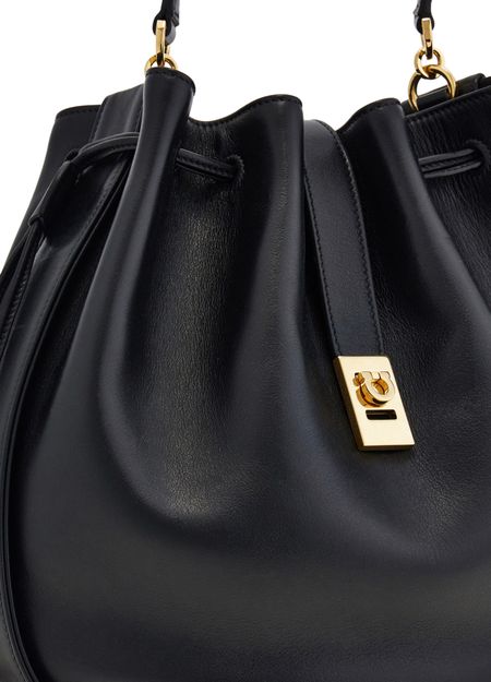 Reveal Salvatore Ferragamo's bucket bag, crafted from smooth leather with a single handle for effortless sophistication. The large interior compartment and drawstring closure, accented by a gold clasp and gold finish, offer both style and practicality for the modern wardrobe.