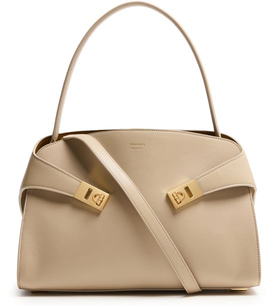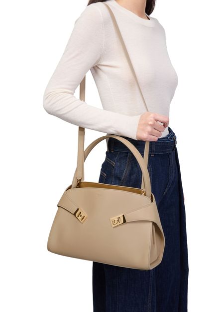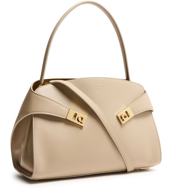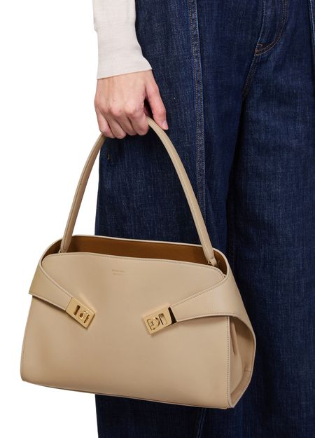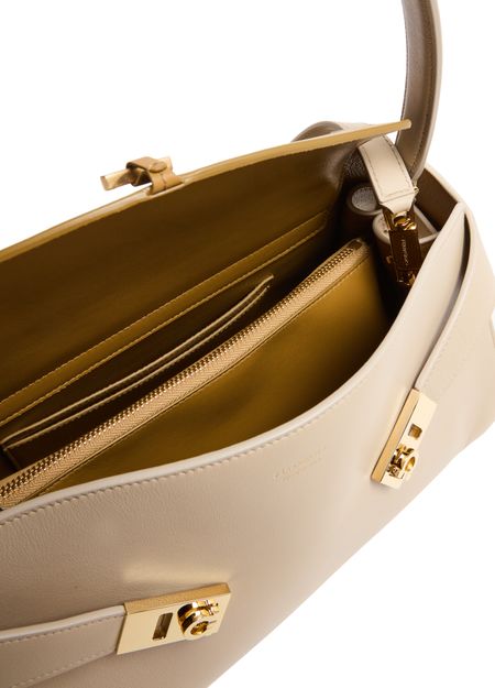 Reveal Salvatore Ferragamo's Hug shoulder bag, crafted from smooth leather with a single handle and a thin, detachable strap for versatile styling. Gold clasp and gold finish details accentuate the front logo, while visible stitching and a zippered interior pocket add refined functionality.