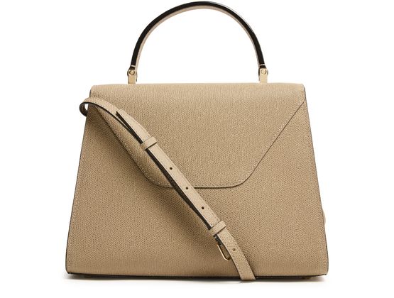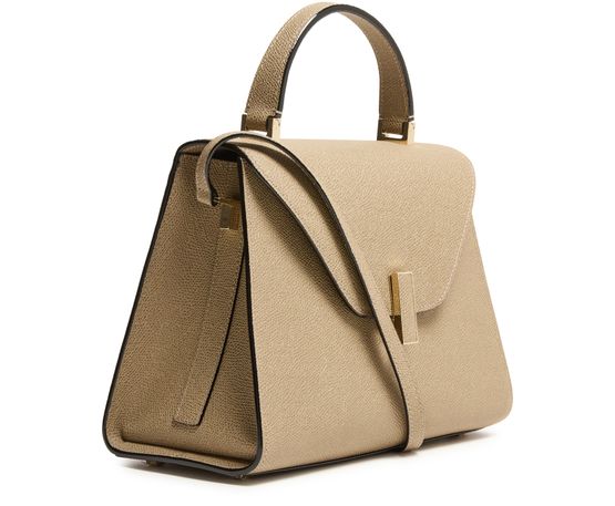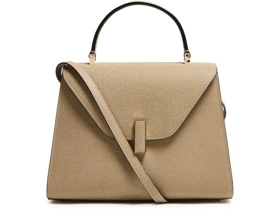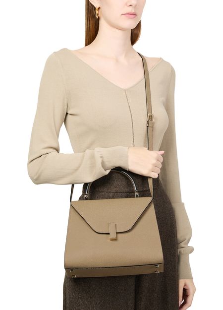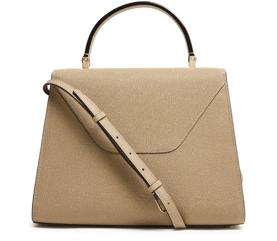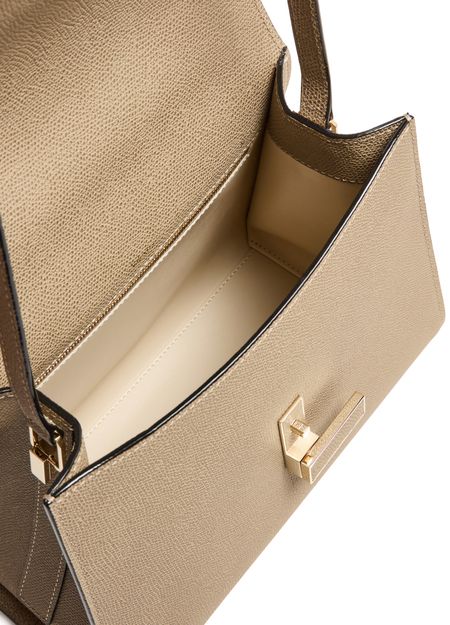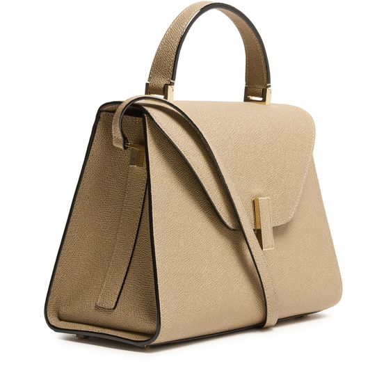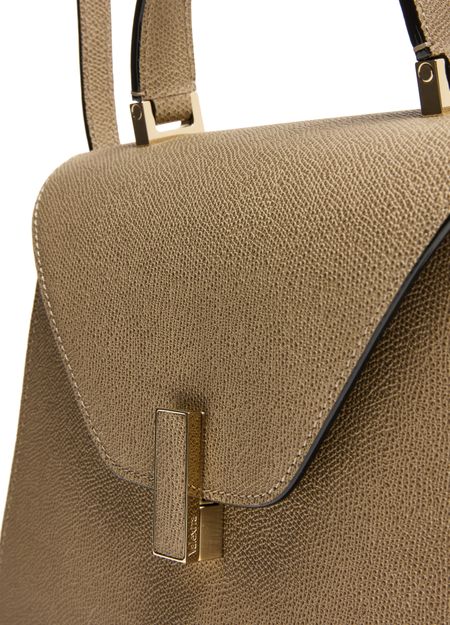 Reveal Valextra's Iside handbag, a masterpiece of grained leather craftsmanship. This shoulder bag features a single handle and a thin, adjustable, detachable strap for versatile wear. The twist lock closure secures a single compartment lined with contrast fabric, highlighted by visible topstitching and a gold finish.