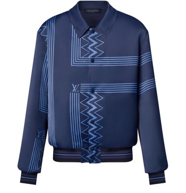 This distinctive bomber jacket displays the LV Karakoram motif, inspired by a vintage scarf, whose zigzag pattern evokes the peaks of the Karakoram mountain range. It is printed onto the indigo fabric with a technique known as discharge, which removes dye instead of applying it. Slightly padded and fully lined, it has snap buttons and a ribbed bottom hem and cuffs.