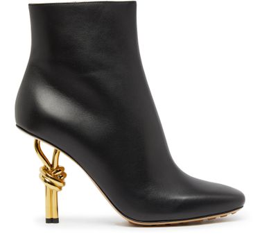 Bottega Veneta's Knot boots are made from smooth leather with a pointed toe and a unique heel design. The boots feature a very thin sole and a gold finish for a luxurious touch. Their pull-on design ensures easy wear, making them a stylish and practical choice for any outfit.