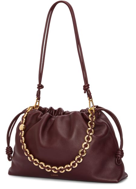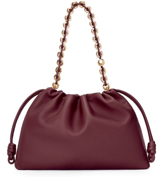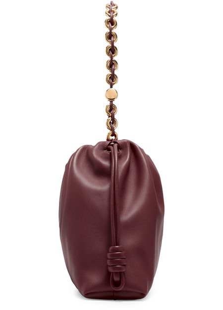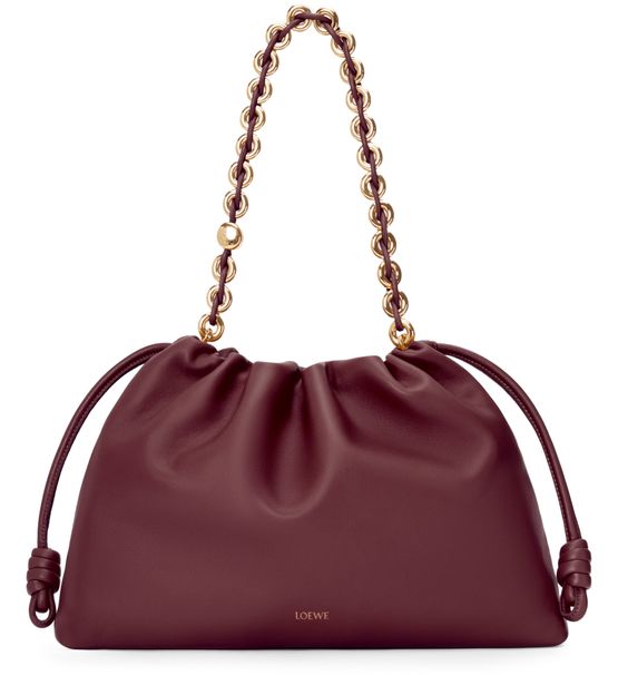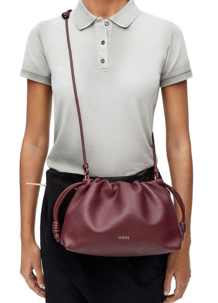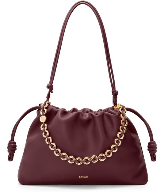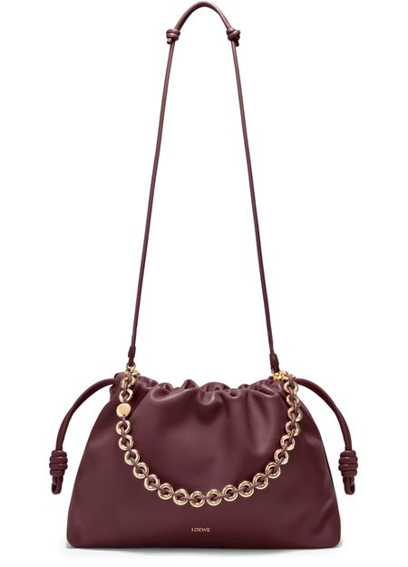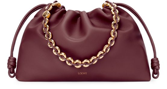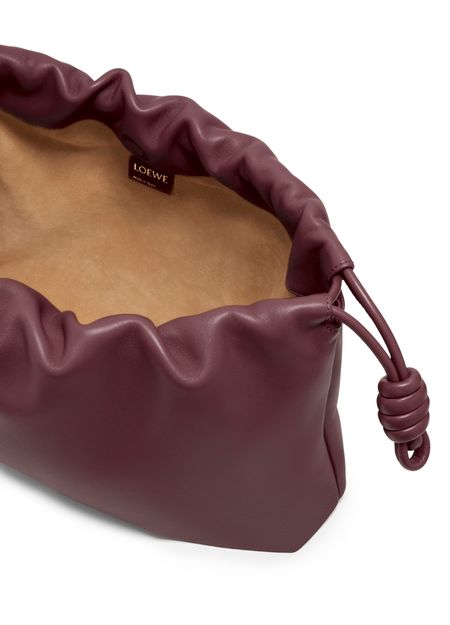 Loewe's Large Flamenco Purse in soft nappa lamb leather boasts a single compartment for effortless organization. Its single handle and detachable strap allow for versatile styling, whether worn on the shoulder or carried by hand. The front logo in gold letters and visible topstitching add a touch of sophistication.