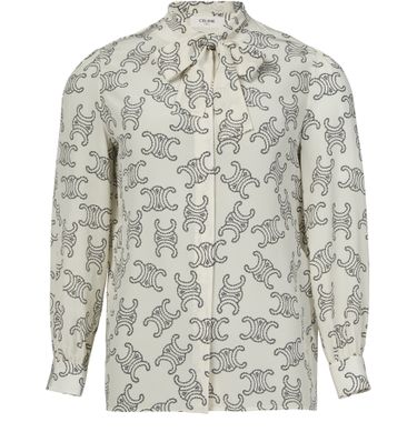 Celine's lavallière blouse in crêpe de chine showcases an elegant design with a concealed closure and visible stitching. Its regular length and long-sleeved silhouette are complemented by cuffed sleeves and buttoned cuffs. The all-over print adds a touch of sophistication, while the lavaliere tie-neck enhances its timeless charm.
