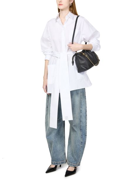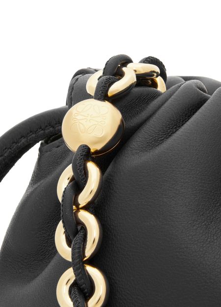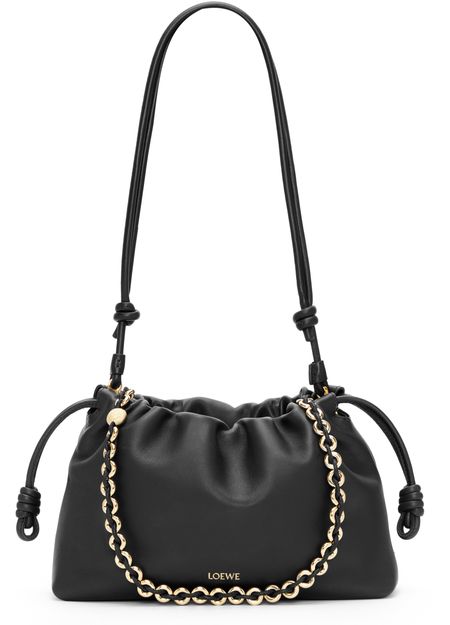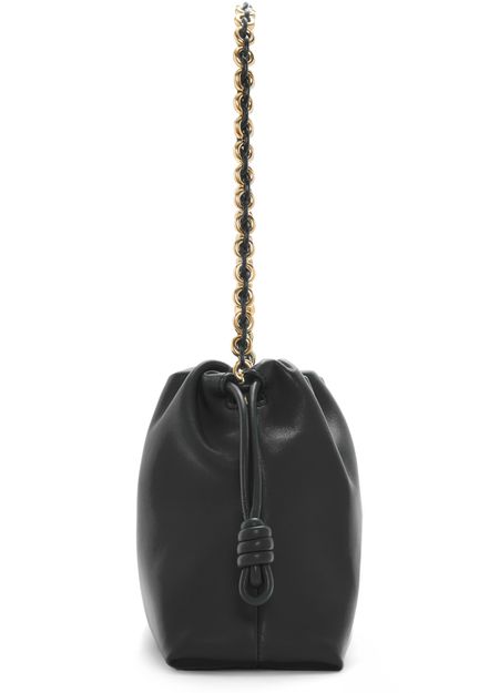 Loewe's Leather Flamenco Purse is a hand carried small bucket bag with a thin strap and single handle. It has a drawstring closure and magnetic closure for security. The single compartment is adorned with an appliquéd logo and gold letters. The front logo is printed for a sleek finish.