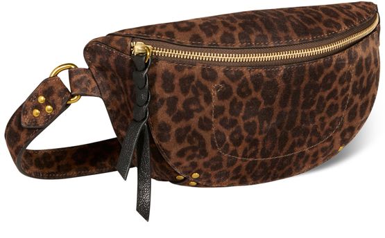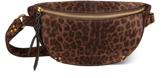 Jérôme Dreyfuss's Lino bag showcases a stylish leopard print with visible topstitching that adds a touch of sophistication. Its zipper closure secures your essentials, while the single handle and adjustable strap allow for versatile wear. Whether worn crossbody or on the hips, this bag is a chic companion for any adventure.