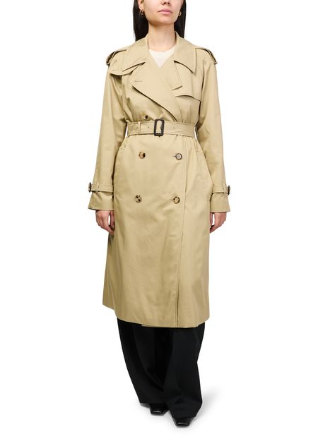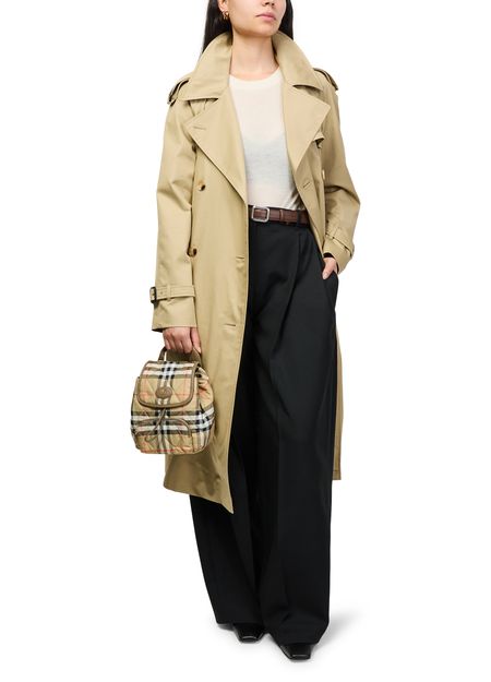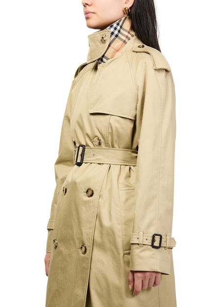 Reveal Burberry's long Castleford trench coat, a refined silhouette featuring a double-breasted closure and classic collar. Long sleeves and side pockets add practical elegance, while the timeless design ensures effortless versatility for any occasion. This piece seamlessly blends tradition with modern sophistication.