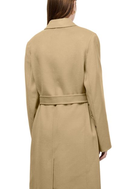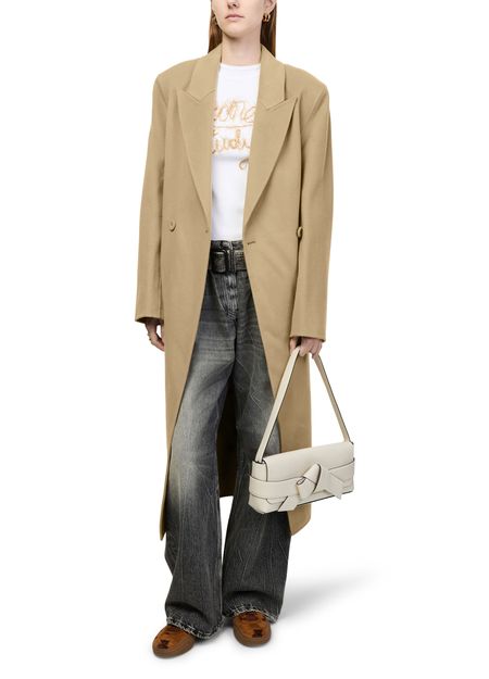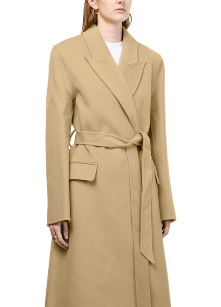Reveal Acne Studios's long belted coat, a refined silhouette featuring a double-breasted closure and structured collar. Flap pockets and long sleeves add practical elegance, while the tailored belt defines the waist. Crafted for versatility, this coat transitions seamlessly from day to evening with modern sophistication.
