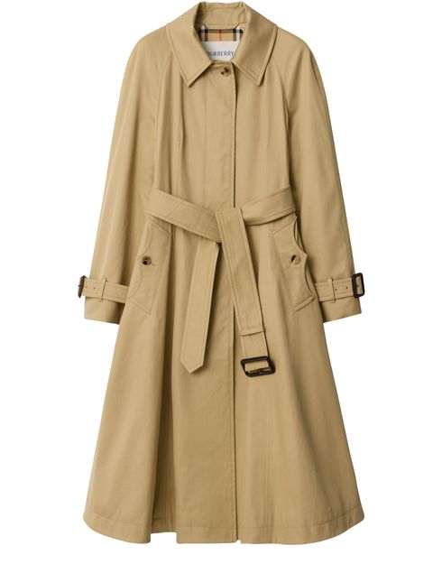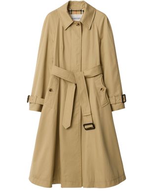 Reveal Burberry's long gabardine ellingham fit-and-flare car coat, a refined silhouette with a tailored fit and elegant collar. Button fastening and flap side pockets add functional sophistication, while the smooth gabardine fabric ensures versatility for both city strolls and formal occasions.