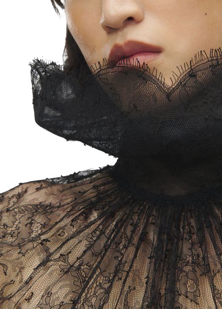 • Description : Slim fit, long, high-neck, ruff, long-sleeved, back buttoned fastening, lace details, scalloped edges, embroidered details.