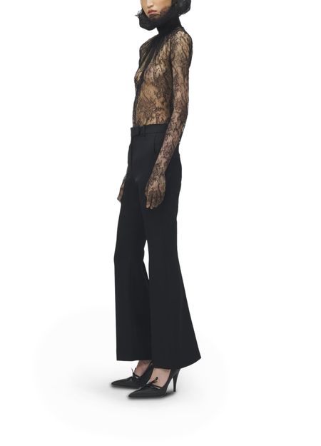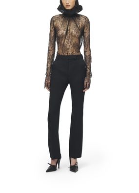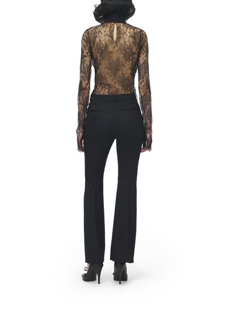 Introducing Alexander McQueen's long-sleeved lace top, a masterpiece of elegance with its high-neck and slim fit. The intricate lace design is complemented by a back buttoned fastening, offering a refined silhouette. Perfect for any occasion, this top pairs beautifully with both casual and formal ensembles.