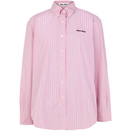 Reveal Miu Miu's long-sleeved oversized shirt, featuring a refined striped print and an embroidered chest logo. The button fastening and cuffed sleeves add a tailored touch, while the relaxed silhouette offers effortless versatility for both casual and elevated looks.