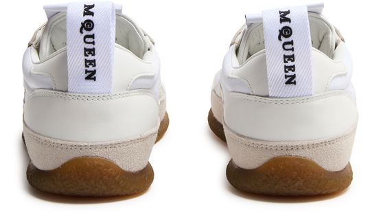 Reveal Alexander McQueen's low-top sneakers, crafted from smooth leather with a round, closed toe and flat heel. The contrasting sole and visible stitching add a modern edge, while laces and a strap ensure a secure fit. Signature logos on the tongue and back complete this standout pair.