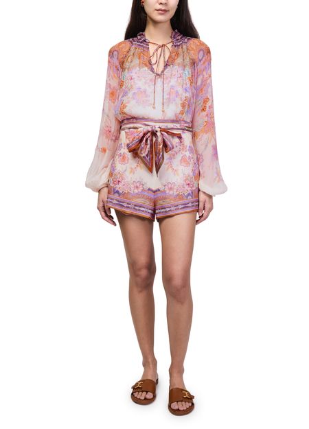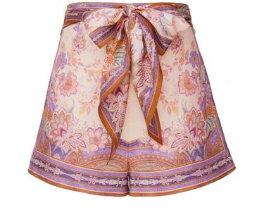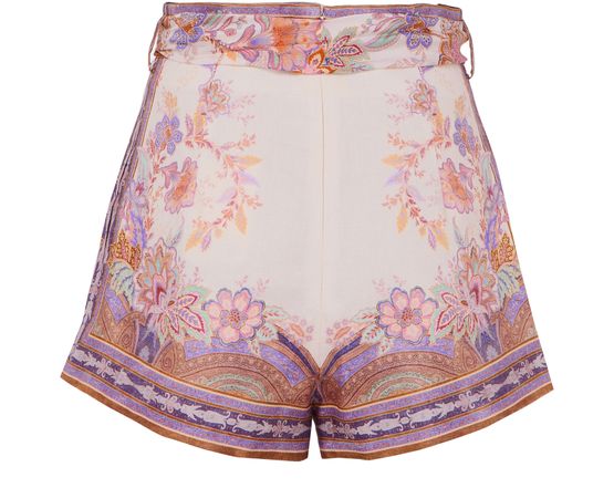 Reveal Zimmermann's Luna belted shorts, crafted in a high-rise silhouette with a vibrant floral print. The detachable belt in matching fabric adds a refined touch, while the knee-length cut ensures comfort and versatility for warm-weather styling or casual outings.
