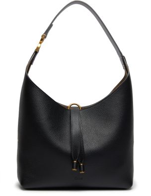 Reveal Chloe's Marcie small grained leather hobo bag with a sophisticated front logo and engraved detailing. This stylish tote features visible topstitching, a wide strap, and a single leather handle. Designed for shoulder wear, it includes a gold finish, single compartment, and zippered interior pocket.