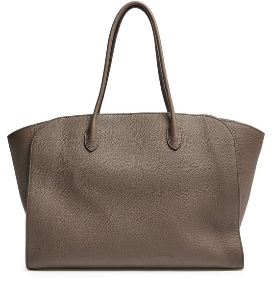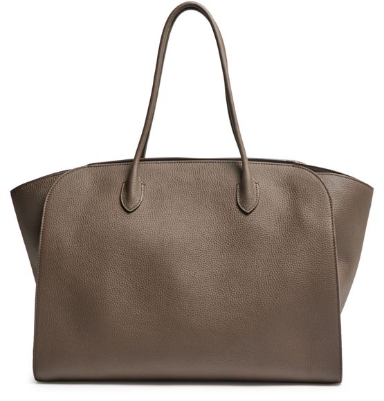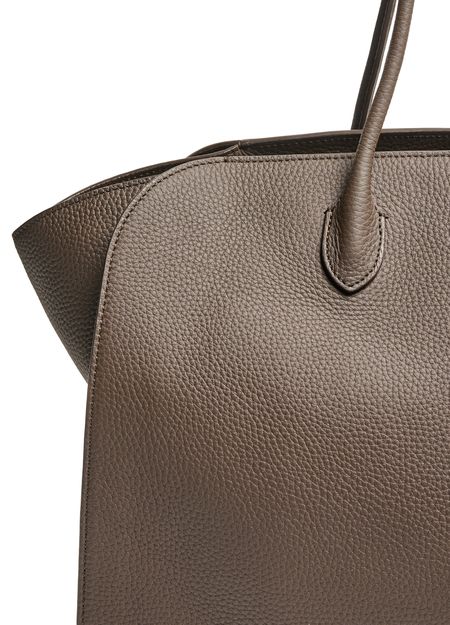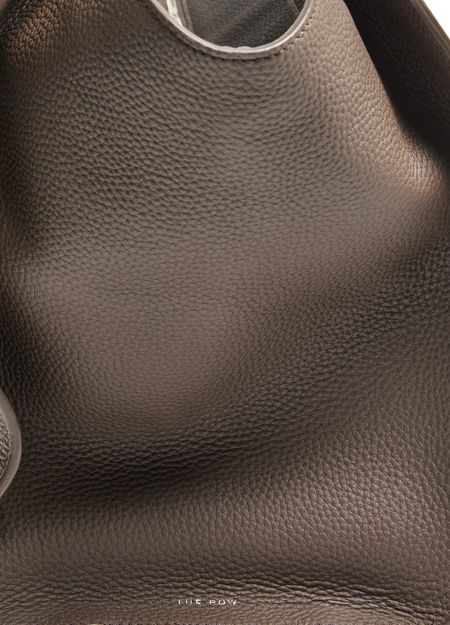 Reveal The Row's Marlo 17 tote bag, crafted from grained leather with double handles for effortless carrying. Visible stitching highlight refined craftsmanship, while a spacious interior, zippered pocket, and contrast lining ensure both style and practicality for your daily essentials.