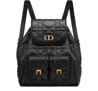 Indulge Dior's Medium Dior Caro Backpack, featuring the iconic CD signature, flap and drawstring closure, and a sophisticated antique gold-finish metal handle. This backpack ensures elegance and functionality with adjustable leather straps, front slip pockets, and an interior slip pocket. A dust bag is included for protection.