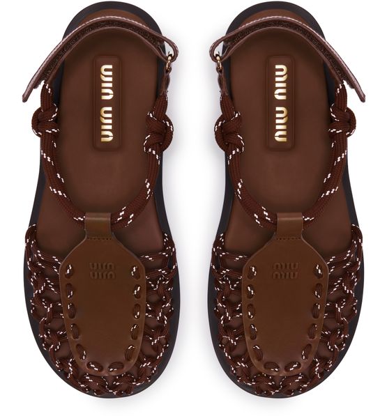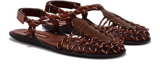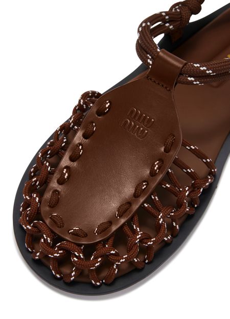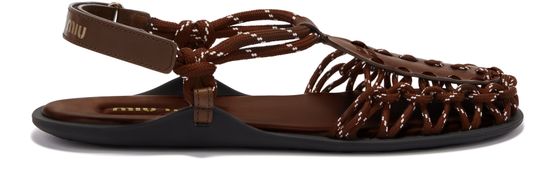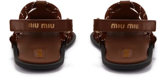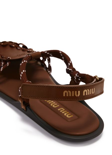Discover Miu Miu's smooth leather Meduse lace-up sandals, crafted with a round toe and buckled strap for a refined fit. The flat heel and logo-printed insole ensure comfort, while gold lettering and a decorative label add a signature touch to these modern essentials.