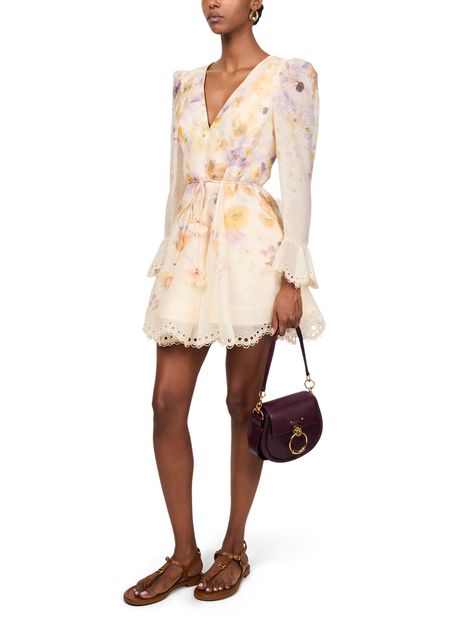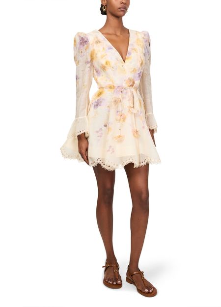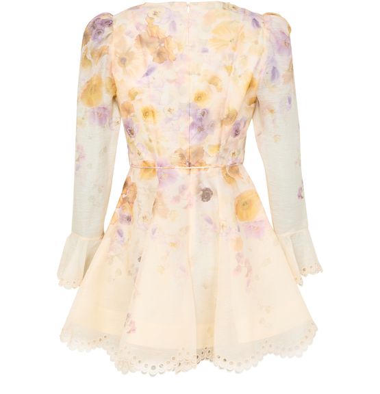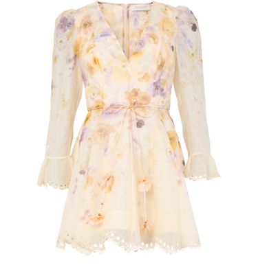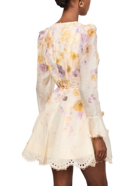 Reveal Zimmermann's Memento embroidered mini dress, a masterpiece of floral print elegance. This slim fit dress features a V-neck and long puff sleeves, accentuated by scalloped edges and embroidered details. The back zipper closure ensures a seamless silhouette, perfect for any stylish occasion.