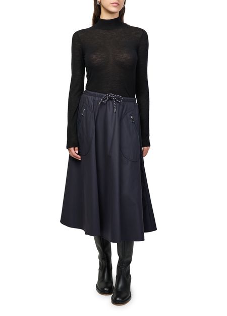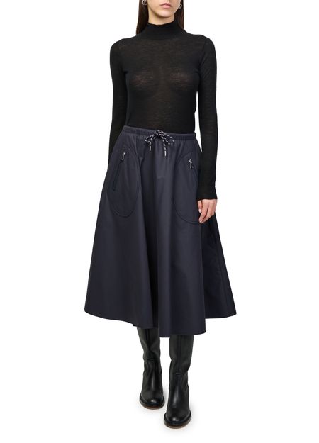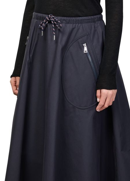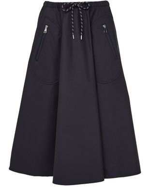 Reveal Moncler's midi skirt, designed with an elasticated drawstring waist for a refined fit. Two front pockets and an embroidered logo on the side add modern flair, making this zippered skirt a versatile choice.