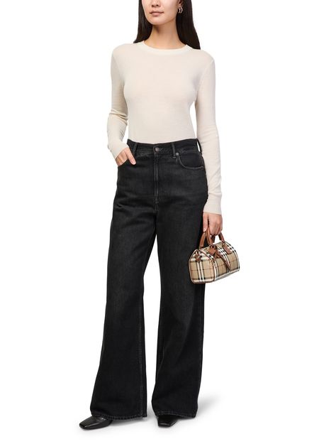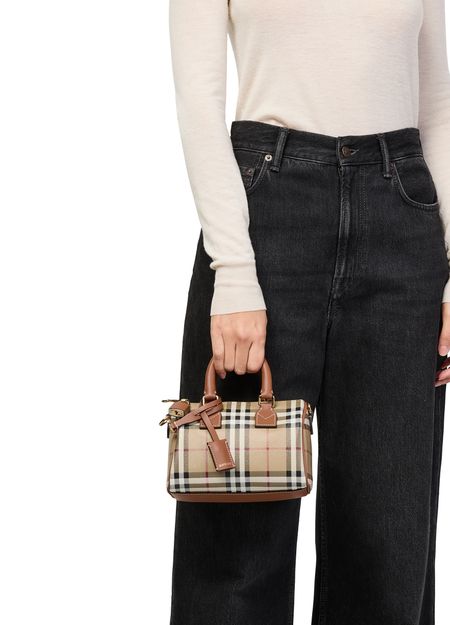 Reveal Burberry's Mini Check bowling bag, crafted from grained leather and embroidered canvas. The iconic Burberry Check pattern and signature 'b' fastener add a refined touch, while an adjustable, detachable thin strap and interior pocket offer versatile functionality for modern style.