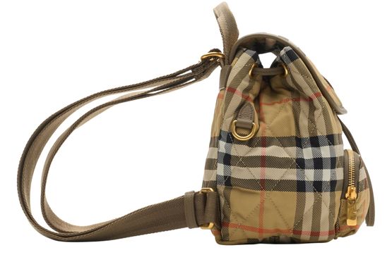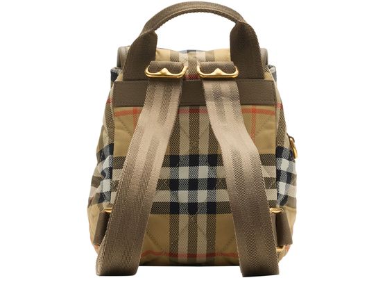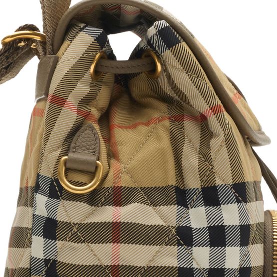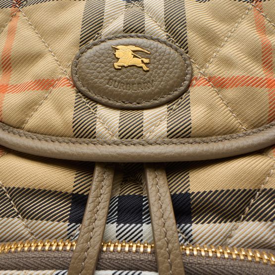 Reveal Burberry's check backpack, a statement piece featuring the iconic equestrian knight design. The adjustable thin strap and single handle offer versatile carrying, while the flap and drawstring closures secure your essentials. Gold-finish accents and a zippered front pocket complete this modern, functional silhouette.