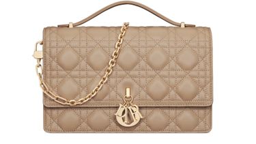 Discover Dior's Mini Miss Dior Bag, an epitome of elegance with its distinctive D.I.O.R. charm. Featuring a sophisticated flap closure, it offers dual interior compartments, a rear patch pocket, and three card slots. The leather top handle and removable jewel chain add versatility to your style.