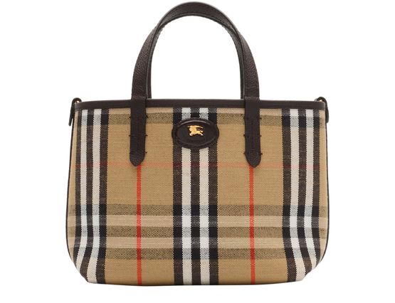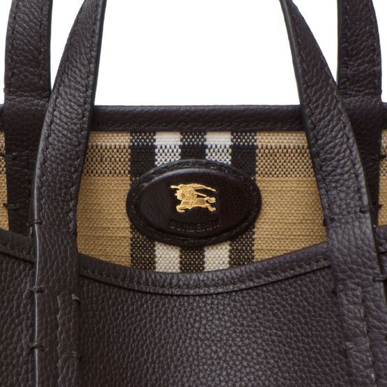 Reveal Burberry's check tote, a statement piece defined by its iconic equestrian knight design and gold finish. Crafted in bi-material with double handles, this tote features visible stitching and a spacious interior compartment, blending signature style with practical sophistication for the modern wardrobe.