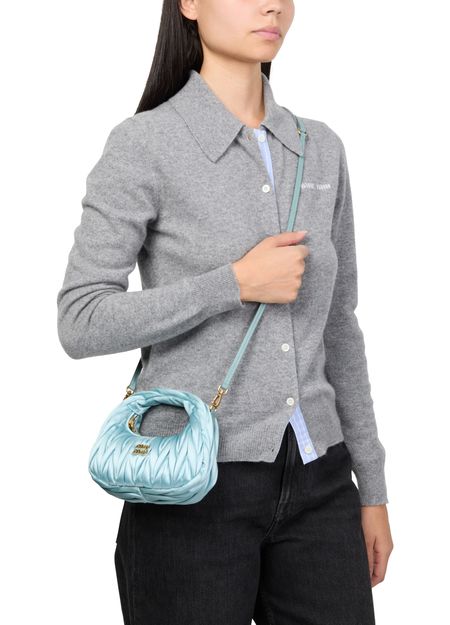 Introducing Miu Miu's mini bag, a masterpiece of modern elegance. Crafted from satin-finish leather, it features the iconic quilted herringbone detail and metallic logo. The detachable thin strap and single handle offer versatile styling, while the zipper closure ensures secure storage. Elevate your ensemble with this chic accessory.