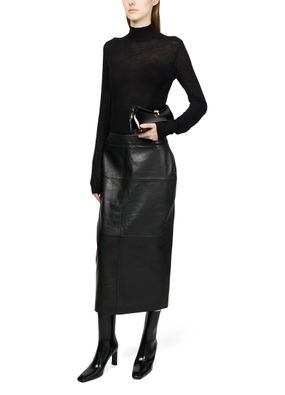 Reveal Toteme's mini T-Lock naplack clutch, a masterpiece of modern design. Crafted from patent leather, it features a twist lock closure and a metallic logo on the front. The interior boasts a single compartment with interior patch pockets, all lined with contrast fabric for a touch of elegance.