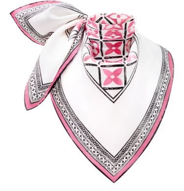 The Monogram Flower Tile square features an eye-catching pattern from the Resort capsule collection, inspired by the carefree days of summer vacation. Louis Vuitton’s famous stylized blossoms appear in a tile-like grid, contrasting with a white border and a graphic edge integrating the House signature. A creative new way to wear the Monogram look.