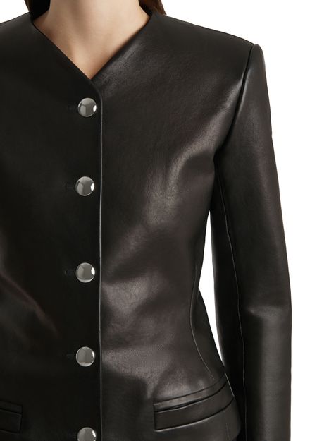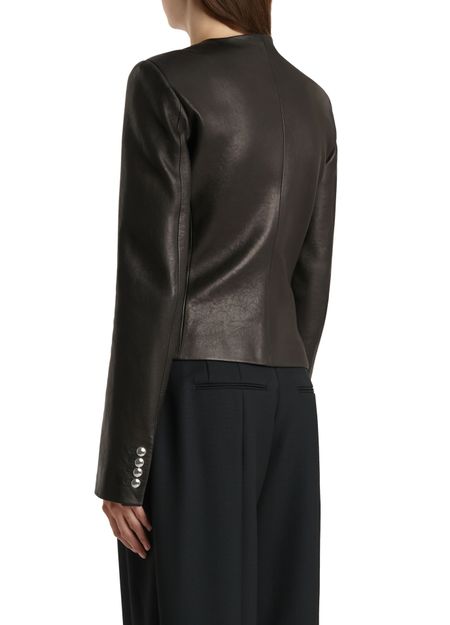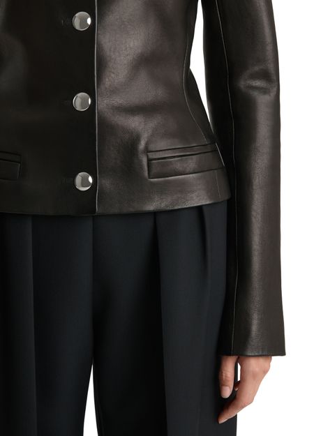 Reveal Khaite's Nara leather jacket, a collarless biker jacket with a short, modern silhouette. Crafted from supple leather, it features long sleeves, button fastening, and sleek welt pockets. This versatile piece transitions effortlessly from day to night, adding a refined edge to any ensemble.