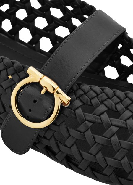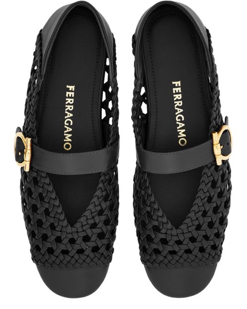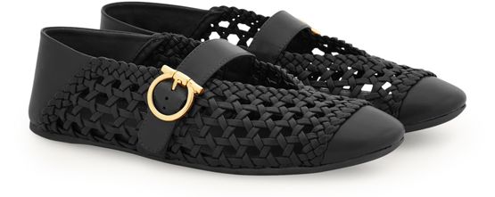 Reveal Salvatore Ferragamo's ballet pumps bring a modern edge to classic footwear. Featuring a pointed closed toe, buckled strap, and flat heel, these shoes are adorned with graphic cut-outs and a gold-finish signature buckle, offering a refined statement for any contemporary wardrobe.
