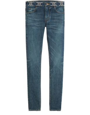 Celine Neo skinny jeans embody effortless sophistication. Crafted with a clean dark union wash, they feature Triomphe stud embroidery at the waist for a unique touch. The skinny fit hugs the waist and legs, complemented by a mid-rise waist and five pockets. Finished with rivets and an engraved zip, these jeans are a stylish staple made in Japan.