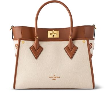 This summery On My Side MM tote bag is made from cream-colored canvas with smooth leather on the trim and top handles. The side gussets are canvas, embroidered with tufted Monogram Flowers in the same color as the leather trim. The interior is lined in striped canvas, reinforcing the beachy feel.