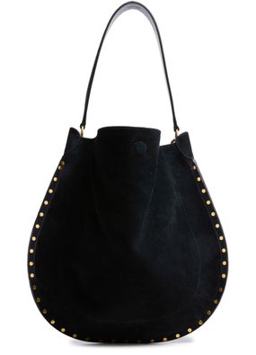 Reveal Isabel Marant's Oskan Hobo Soft Bag, a masterpiece of modern design. Crafted from luxurious suede, this hobo bag features a single handle and magnetic closure. The studded details and embossed logo add a touch of elegance, Outer edge adorned with gold-finish studs.