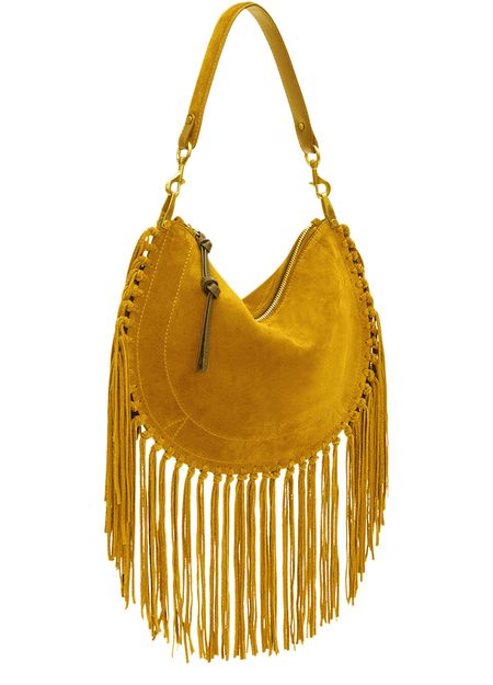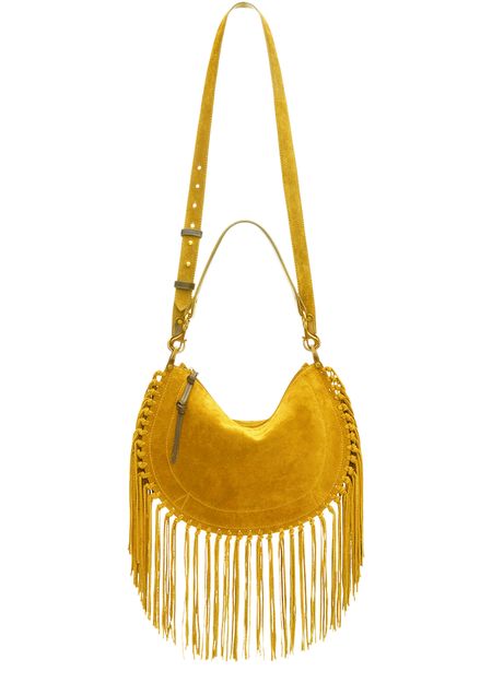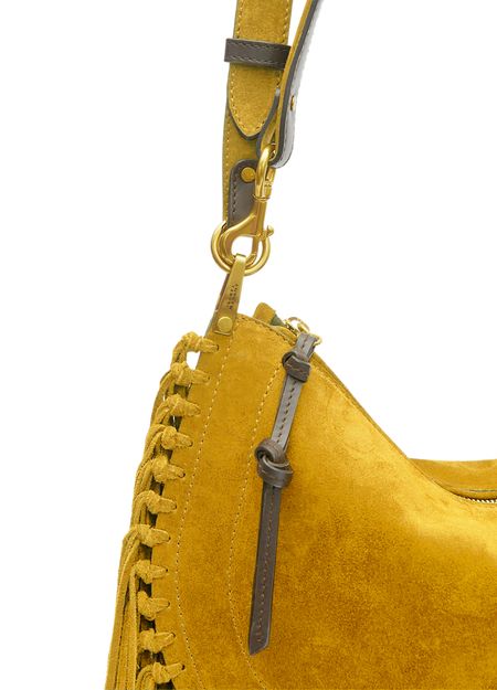 Reveal Isabel Marant's Oskan soft zipped shoulder bag, crafted from supple suede with a single handle and a thin, adjustable strap for versatile wear. Gold-finish hardware and visible stitching accentuate its refined silhouette, while fringe details and an interior pocket add both flair and function.