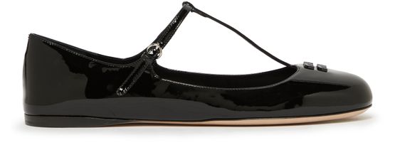 Miu Miu's Patent leather ballet flats showcase a chic design with a round toe and flat heel for effortless elegance. The closed silhouette features visible stitching and a buckled strap, while the logo-printed insole adds a touch of luxury. Perfect for any occasion, these ballet pumps elevate your style with grace.