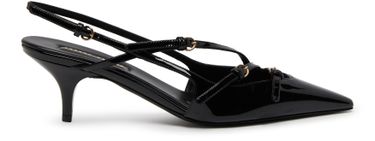 Miu Miu's patent leather multi-strap slingbacks are a stylish choice for any outfit. With a sleek design featuring pumps and buckled straps, these shoes have a very thin sole for a modern look. The contrast details and smooth leather add a touch of sophistication to this versatile footwear.