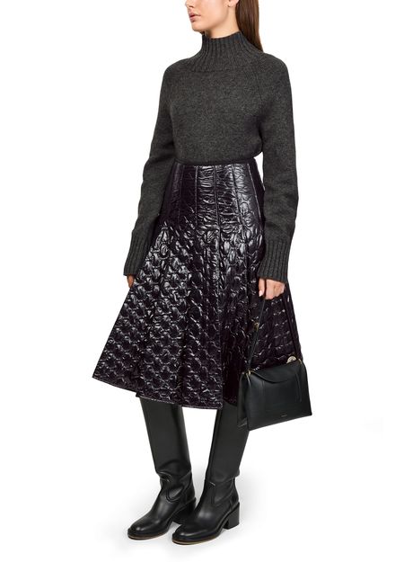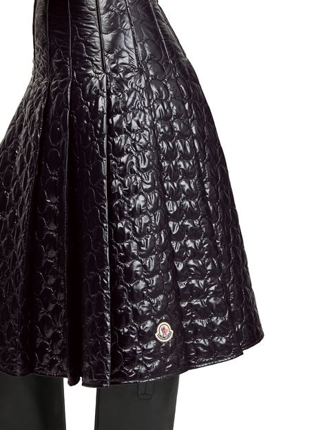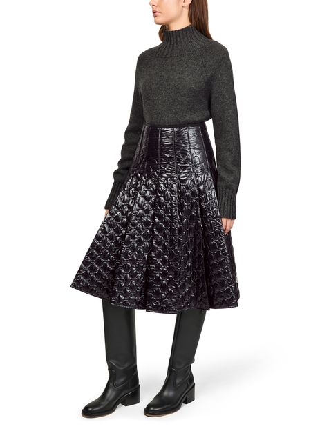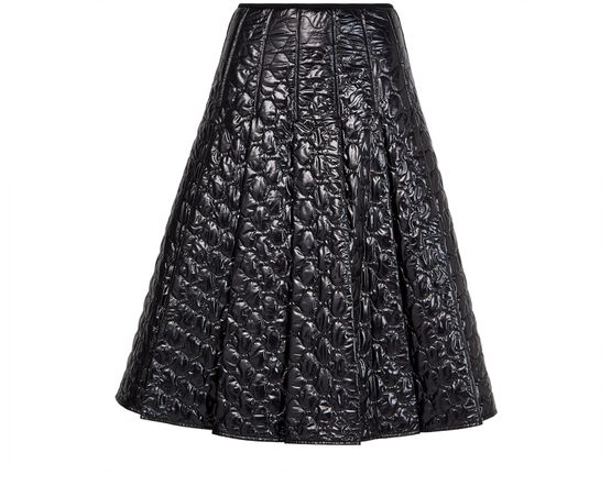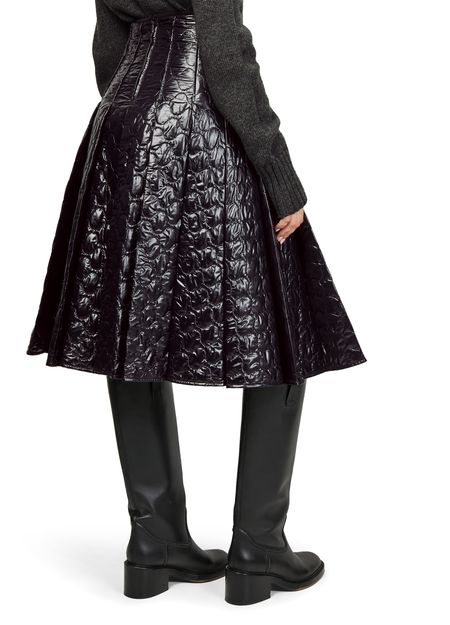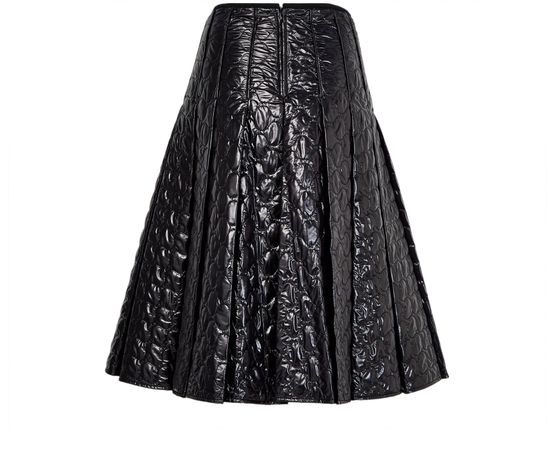 Indulge Moncler's knee length, diamond pattern midi skirt. Crafted from patent leather, it features pleated details and a back zipper closure. The padded texture and visible stitching enhance its modern appeal, making this skirt a versatile piece for both daytime and evening occasions.