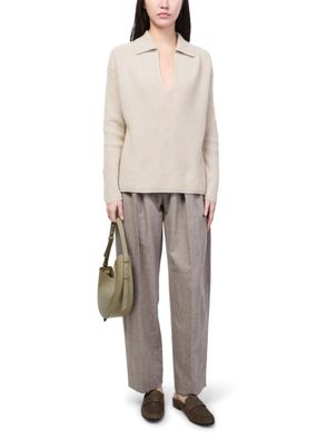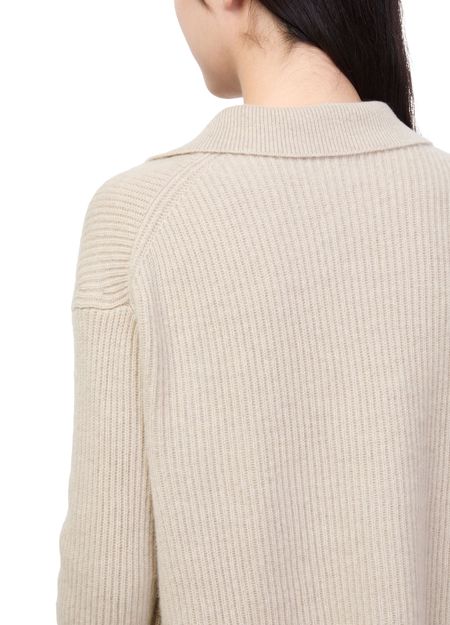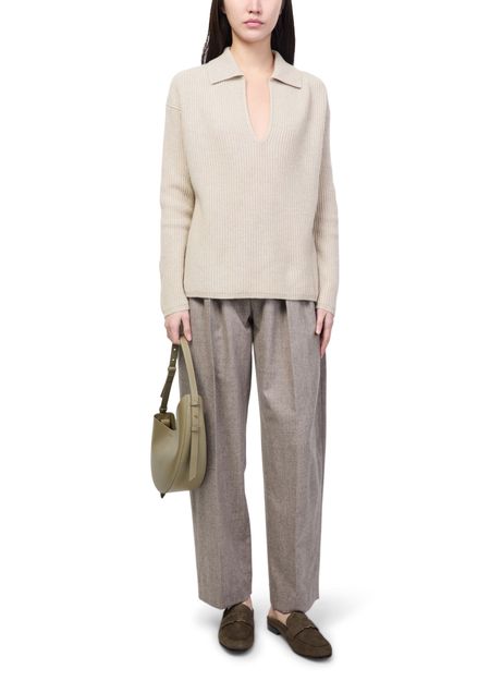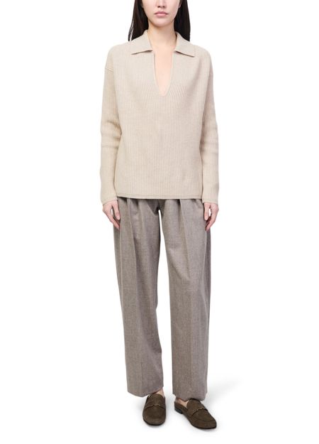 Reveal Max Mara's polo neck sweater featuring a flattering V-neck and long sleeves. The ribbed texture and visible stitching add a modern edge, while its long silhouette offers versatile styling for any occasion. Pair effortlessly with tailored pants or relaxed denim for a polished look.